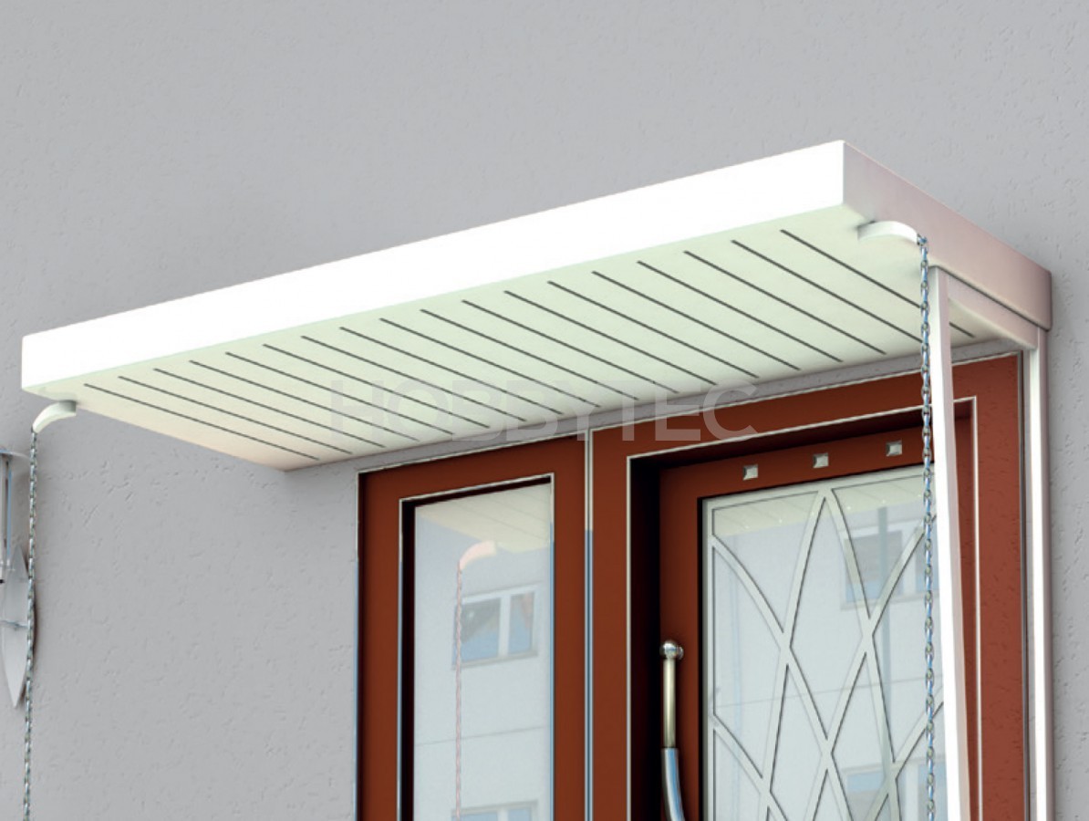 Bejárati előtetők alumínium por színes műanyag illesztett trapezius. Tartalmaz továbbá egy integrált ereszcsatorna két kimenettel oldalán. A bejárat lombkorona alkalmas tetőfedő bejáratok, erkélyek, kirakatok vagy tetőfedő, például több ATM-ek. Ez a fajta tető lehetséges kínálati oldalon. Tesztelve hóteher 75 kg / m2.