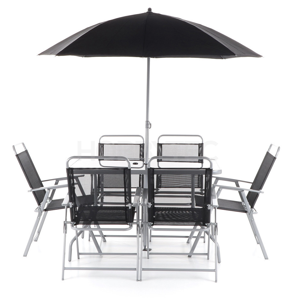 Kerti alumínium bútor Sigma Scorpii áll 6 kényelmes összecsukható szék és egy asztal alumínium-acél profilok, felület módosítása és befejezése comaxite napernyő fogantyú átmérője 200 cm. Asztallapok edzett üvegből készült. A székek borítja vízálló anyagból textilene. Nem alkalmas a hosszú távú használatra nedves környezetben.