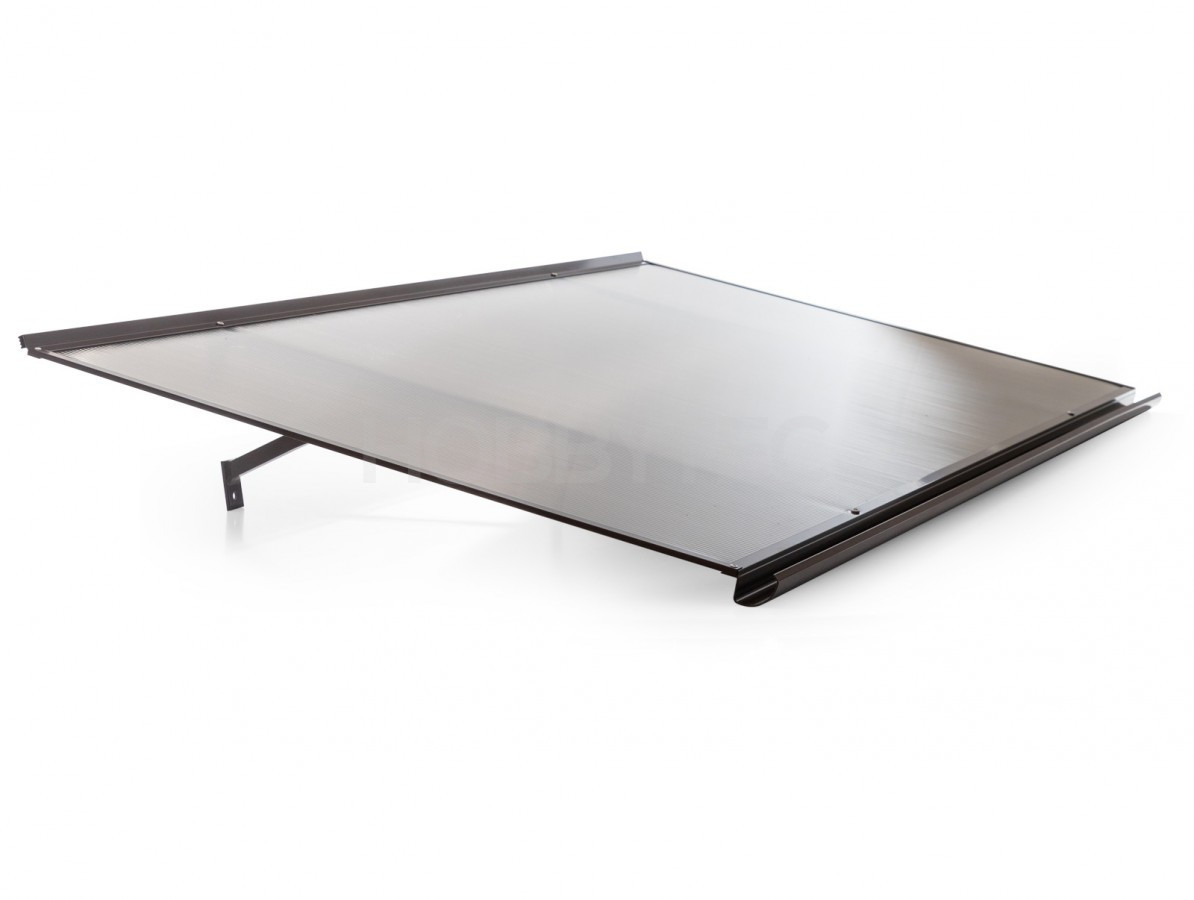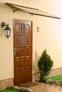 Egyenes tető felett a bejárati ajtó Gutta szabványos 4,5 mm-es polikarbonát és cavernulous por bevonatú alumínium profilok. STANDARD bejárati előtetők alkalmas tetőfedő bejáratok, erkélyek, kirakatok vagy tetőfedő, például több ATM-ek.
