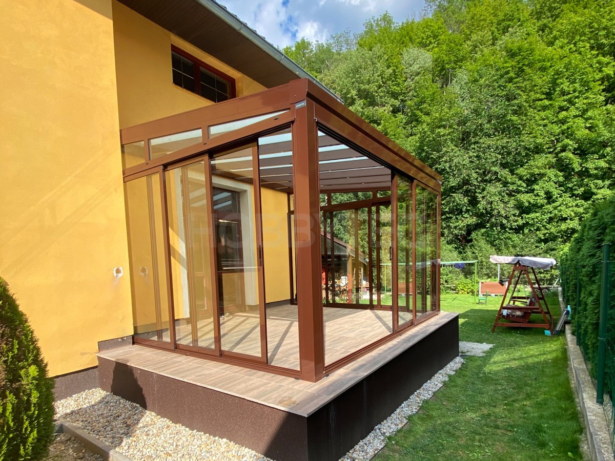 A kert elülső falában tolóajtók találhatók. Az ablakok szilárd üvegből készülnek, alumínium keretben. Kiváló tulajdonságainak köszönhetően az alumínium szerkezet teljesen karbantartásmentes.